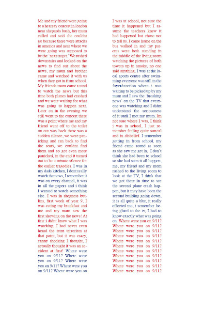 I got some really good responses, I short of hoped a lot of people would write quite detailed responses and they have. I didn't have a clear idea what I was going to do with them but I think I've found a pretty good (graphicy) way to show them. With these I want to put video's of news reports, to eventually read to showing how the media portray big news stories, but that's something I am researching and need to do a lot more reading/watching on, to do properly. I would like to show these as either prints or projections with the videos I plan to make, at the same time, these are in no way, shape or form finished pieces, I haven't done one for diana yet, because I attempted to use the ones for that, within a video (which didn't work very well) and I dont know where to start with doing it in this style. I would like to get more people to answer the questions, hence the multiple where were you when......'s at the end of both images.